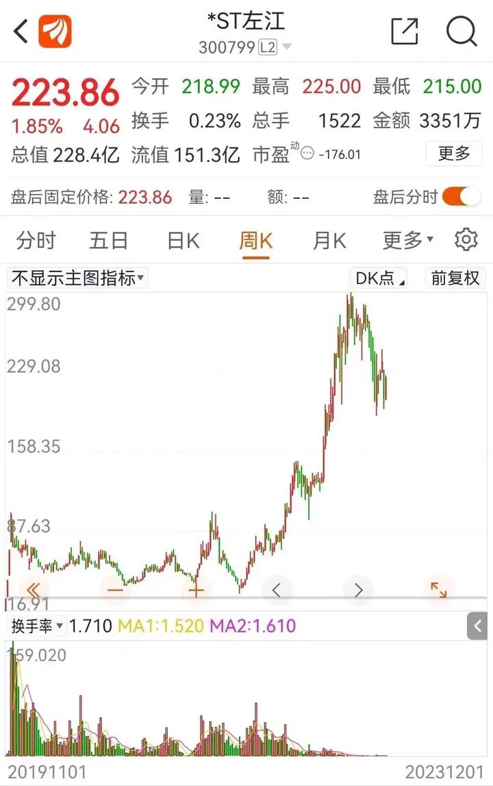 从2022年4月28至2023年7月13日,*ST左江持续一路逆势上扬,从最低的32.08元/股攀升至最高299.80元/股,累计涨幅接近8倍。