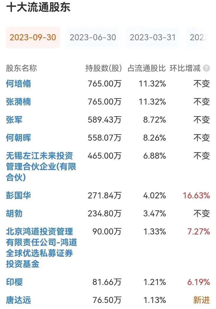 而唐达远也同为2022年年报进入公司股东榜,但此后由于股东榜门槛线提高,其从2023年一季报中“消失”,后于今年三季报重新上榜。在公司尚未进行转增的前提下,对比其前后持股比例不难看出,唐达远也在今年实施了增持,截至今年9月末其持股比例为1.13%。