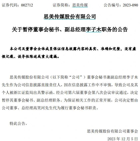 12月4日,思美传媒发布公告称,董事会秘书兼副总经理李子木作为公司信息披露直接责任人,因在信息披露工作中不审慎,导致公司及其个人被浙江证监局出具警示函。经董事会审议通过,决定暂停其董事会秘书、副总经理职务,暂由公司董事、总经理高笑河代为履行董事会秘书职责。
