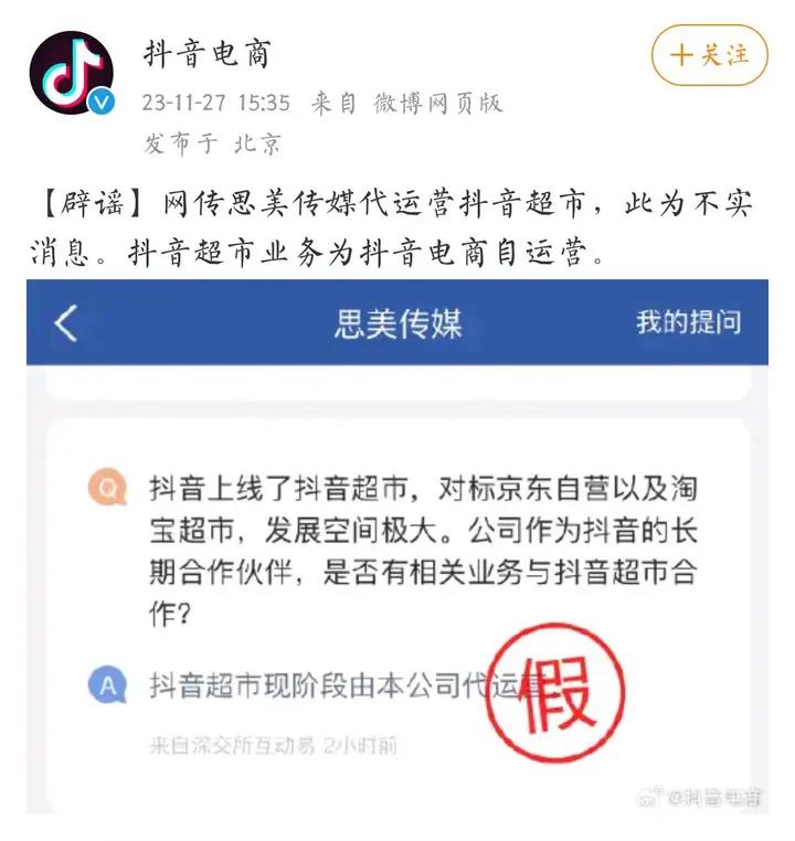 值得注意的是,11月27日,抖音电商在社交媒体发文称,网传思美传媒代运营抖音超市,此为不实消息。抖音超市业务为抖音电商自运营。