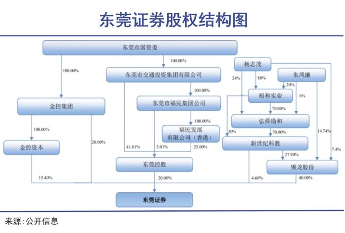 目前,锦龙股份以及同样由杨志茂控制的新世纪科教分别持有东莞证券40%、4.60%的股权。而东莞市国资委通过东莞发展控股股份有限公司、东莞金融控股集团有限公司、东莞金控资本投资有限公司间接控制东莞证券55.40%的股份。