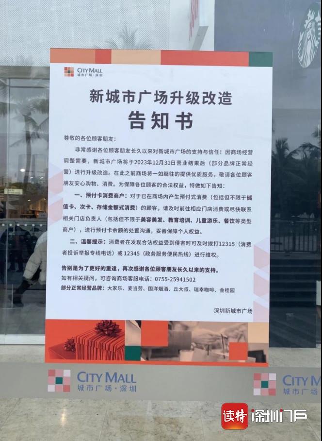读特记者发现,新城市广场几个关键出入口,已张贴了《新城市广场升级改造告知书》。告知书称,因商场经营调整需要,新城市广场将于2023年12月31日营业结束后(部分品牌正常经营)进行升级改造。在此之前商场将一如既往提供优质服务。