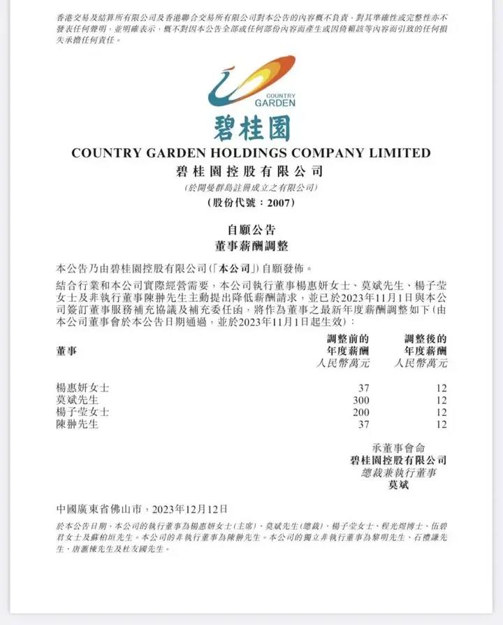 碧桂园12月12日晚间在港交所公告,结合行业和本公司实际经营需要,本公司执行董事杨惠妍、莫斌、杨子莹及非执行董事陈翀主动提出降低薪酬请求,并已于2023年11月1日与公司签订董事服务补充协议及补充委任函。