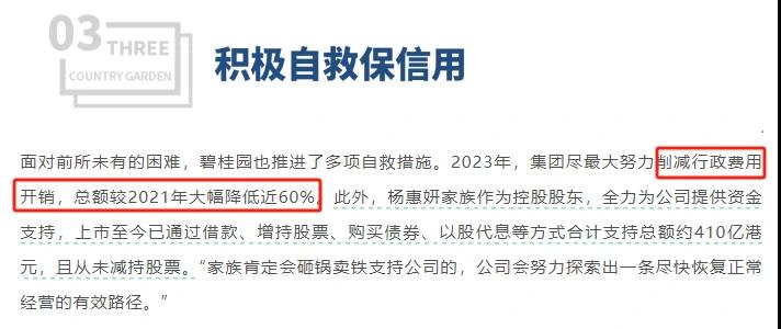 此前,碧桂园就披露,面对前所未有的困难,推进了多项自救措施,其中提及,“2023年,集团尽最大努力削减行政费用开销,总额较2021年大幅降低近60%”。