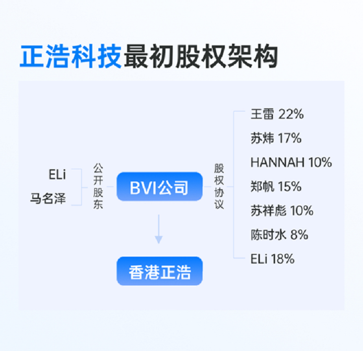 曾担任正浩科技CEO的Eli(美国籍)向记者透露,他于2016年下半年加入创始团队,主管公司营销与海外渠道拓展等,同时也是正浩科技的“创始股东”之一。而如今,他已被“踢”出了自己联合创办的公司。同样自称被“出局”的还包括苏炜。据其透露,正浩科技最早是他与另一位“创始股东”陈时水在2016年上半年发起成立的创业项目,后陆续引入了Eli、郑帆、HANNAH、王雷四个联合创始人。而他和陈时水作为发起人,却在公司成立后经过若干次股权结构分配,最终持股变为0。