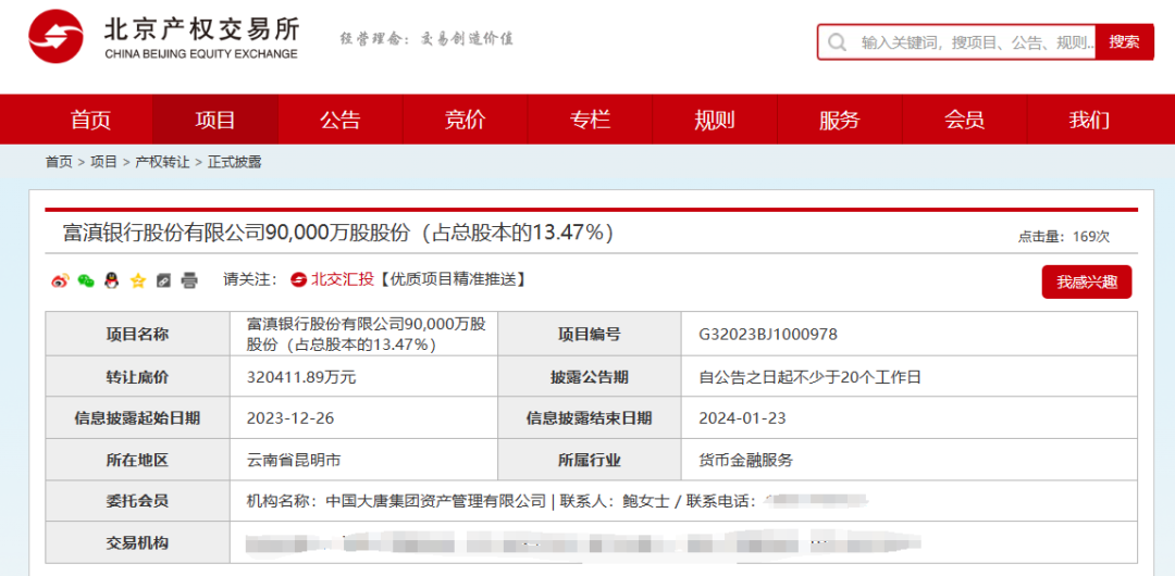 北京产权交易所信息显示,富滇银行目前注册资本、实收资本均为66.8亿元,系国有控股企业。大唐财务预计转让其持有的全部富滇银行股份,共计9亿股,占总股本的13.47%;转让底价为320411.89万元,信息披露起始日为12月26日。