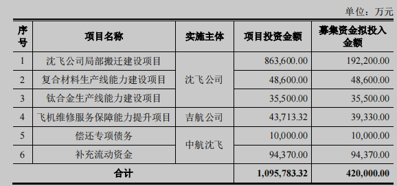 12月26日晚间,中航沈飞公告,拟定增募集42亿元用于六大项目,其中投资最大的三个项目分别为沈飞公司局部搬迁建设项目(简称:搬迁建设项目)、补充流动资金、复合材料生产线能力建设项目,募集资金拟投入金额分别为19.22亿元、9.44亿元、4.86亿元。