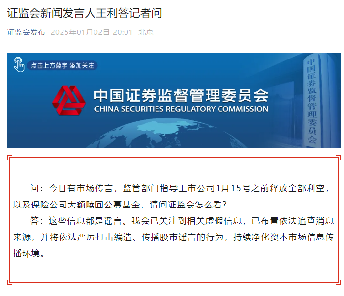 2日晚间,据证监会官微,今日(1月2日)有市场传言,监管部门指导上市公司1月15号之前释放全部利空,以及保险公司大额赎回公募基金,请问证监会怎么看?