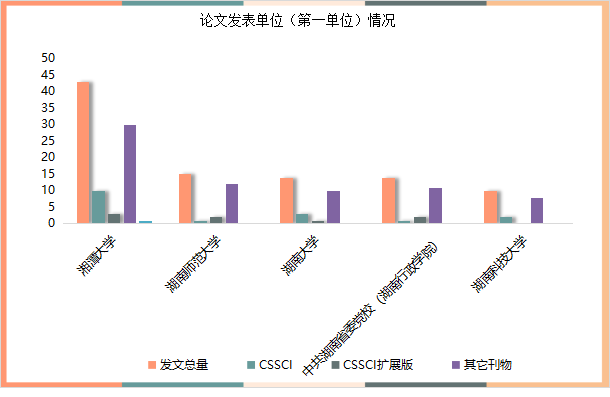 具体单位发布情况如下:湘潭大学CSSCI来源期刊10篇,中央级报刊7篇;湖南大学CSSCI来源期刊3篇;湖南科技大学CSSCI来源期刊2篇,中央级报刊2篇;中南大学CSSCI来源期刊2篇;中共湖南省委党校(湖南行政学院)CSSCI来源期刊1篇,中央级报刊1篇;湖南师范大学CSSCI来源期刊1篇。