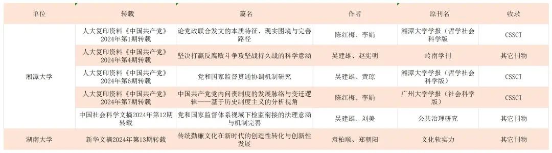 具体文章为:吴建雄、赵宪明:《坚决打赢反腐败斗争攻坚战持久战的科学意涵》,由人大复印资料《中国共产党》2024年第4期转载;吴建雄、黄琼:《党和国家监督贯通协调机制研究》,由人大复印资料《中国共产党》2024年第6期转载;吴建雄、刘美:《党和国家监督体系视域下检监衔接的法理意涵与机制完善》,由中国社会科学文摘2024年第12期转载。陈红梅、李娟:《论党政联合发文的本质特征、现实困境与完善路径》,由人大复印资料《中国共产党》2024年第1期转载;《中国共产党党内问责制度的发展脉络与变迁逻辑——基于历史制度主义的分析视角》,由人大复印资料《中国共产党》2024年第7期转载。袁柏顺、郑朝阳:《传统勤廉文化在新时代的创造性转化与创新性发展》,由新华文摘2024年第13期转载。