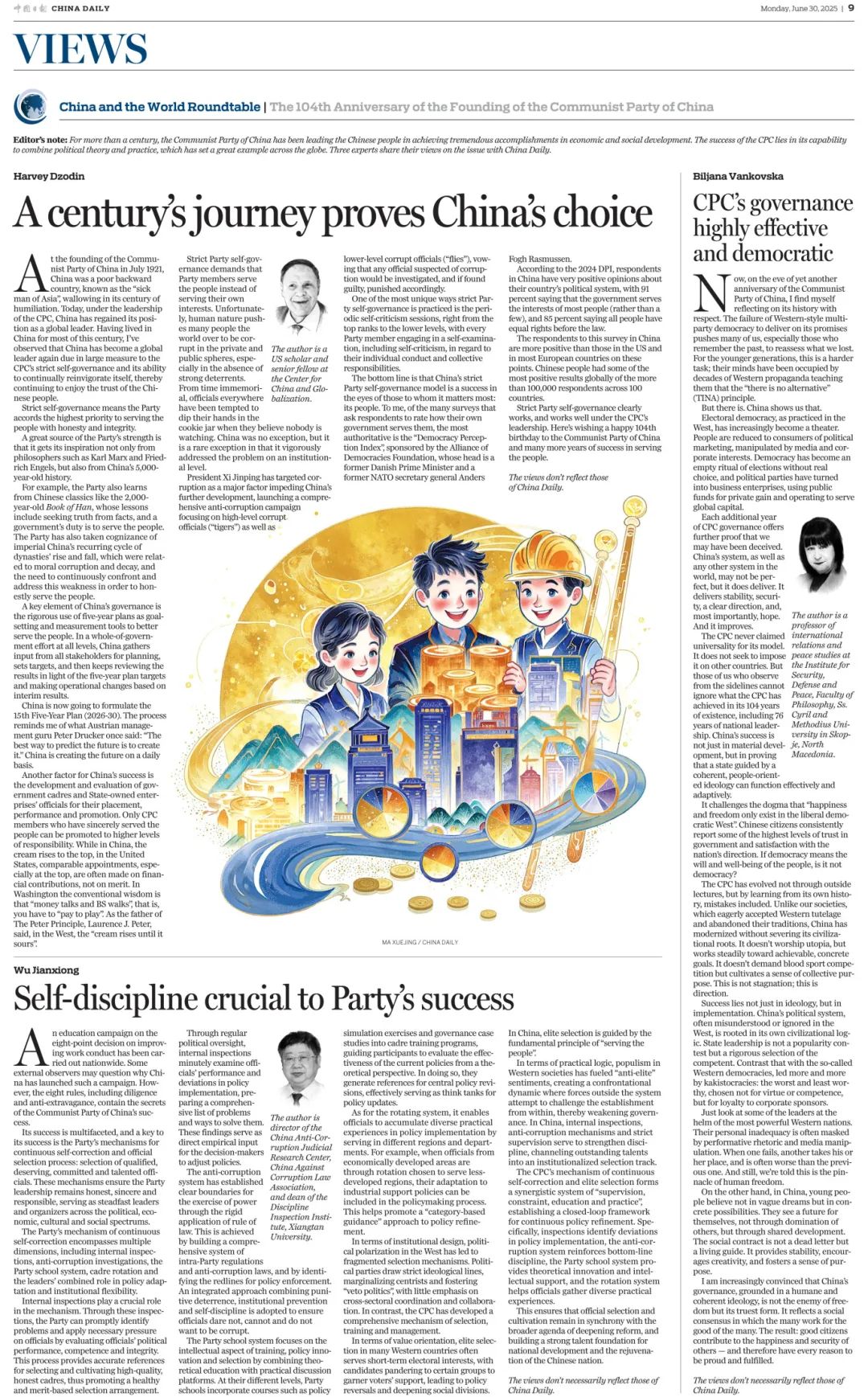 《中国日报》编者按:一个多世纪以来,中国共产党领导中国人民取得了经济社会发展的巨大成就。中国共产党的成功在于其将政治理论与实践相结合的能力,这在全球范围内树立了榜样。本报邀请全球化智库(CCG)高级研究员,美籍专家哈维佐??;北马其顿圣基里尔·麦托迪大学哲学学院,安全、防务与和平研究所,国际关系与和平研究的全职教授(终身教授)万科夫斯卡;中国反腐败司法研究中心主任,湘潭大学纪检监察研究院院长,博士生导师吴建雄教授三位专家一起分享了他们对这个问题的看法。