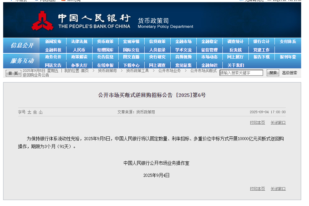 为保持银行体系流动性充裕,2025年9月5日,中国人民银行将以固定数量、利率招标、多重价位中标方式开展10000亿元买断式逆回购操作,期限为3个月(91天)。