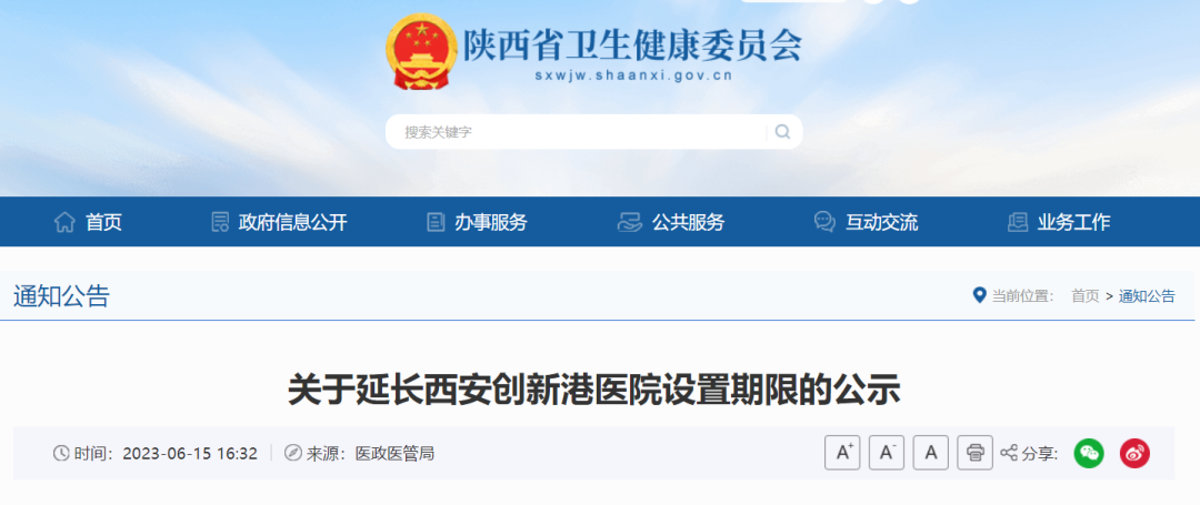 接着是效期延长后的半年后,2023年6月15日,陕西省卫生健康委医政医管局再次发布《关于延长西安创新港医院设置期限的公示》,公示内容表明,经研究,拟同意将西安创新港医院设置有效期延长12个月,至2023年12月3日。