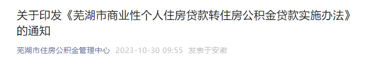 10月30日,安徽芜湖市住房公积金管理中心正式发布《芜湖市商业性个人住房贷款转住房公积金贷款实施办法》,并于2023年12月1日起正式执行。