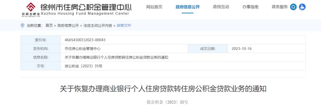 在江苏徐州,已于10月16日恢复办理商业银行个人住房贷款转住房公积金贷款,也就是“商转公”业务。