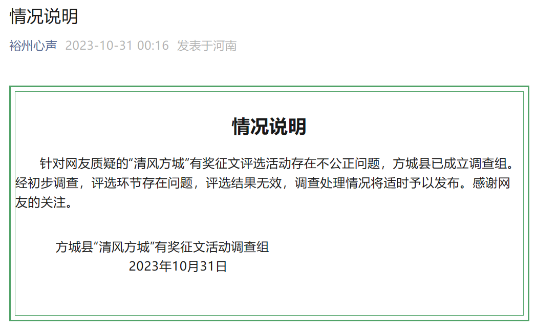 方城县“清风方城”有奖征文活动调查组10月31日发布情况说明,针对网友质疑的“清风方城”有奖征文评选活动存在不公正问题,方城县已成立调查组。经初步调查,评选环节存在问题,评选结果无效,调查处理情况将适时予以发布。
