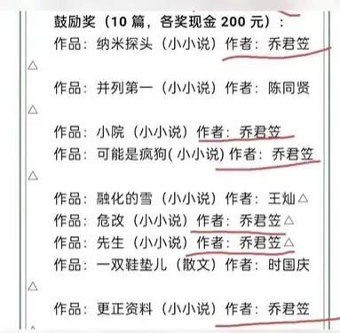 截至6月30日截稿,共收到49篇文艺作品。一等奖2篇,二等奖5篇,三等奖6篇,鼓励奖12篇,共计25篇获奖作品。名单显示,乔某笠有12篇作品获奖,一等奖1篇;二等奖1篇;三等奖4篇;鼓励奖6篇?;瘫ù蠓缧挛偶钦咦⒁獾?,10月30日,该推文已被删除。