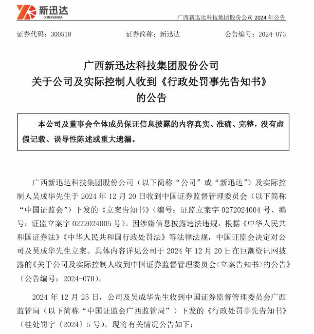 12月25日,新迅达(300518)公告称,公司及实际控制人吴成华收到广西证监局下发的《行政处罚事先告知书》。