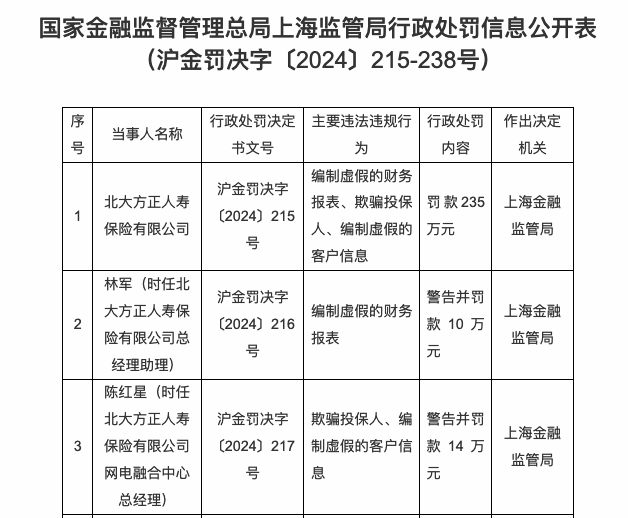 1月2日,国家金融监督管理总局行政处罚信息显示,因编制虚假的财务报表、欺骗投保人、编制虚假的客户信息,上海金融监管局近日对北大方正人寿保险有限公司(以下简称“北大方正人寿”)开出235万元罚单。