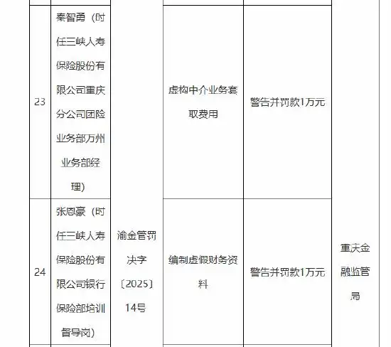 2025年3月28日,国家金融监督管理总局重庆监管局发布的信息显示,总部位于重庆的全国性人寿保险公司——三峡人寿保险股份有限公司(以下简称“三峡人寿”)及其重庆分公司因编制虚假报告、编制虚假财务资料、公司治理混乱被重庆金融监管局处罚(渝金管罚决字〔2025〕14号 )。