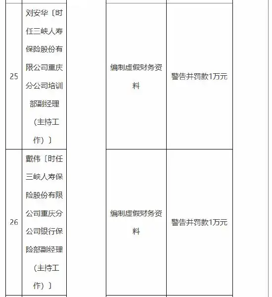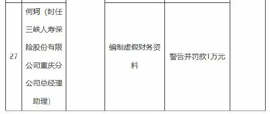 处罚信息显示,三峡人寿因编制虚假报告, 编制虚假财务资料,公司治理混乱被???0万元;三峡人寿重庆分公司因编制虚假财务资料、虚构中介业务套取费用被罚款25万元;时任三峡人寿董事会秘书刘再辉被警告2次并???0万元;时任三峡人寿重庆分公司团险业务部万州业务部经理秦智勇被警告并罚款1万元;时任三峡人寿银行保险部培训督导岗张恩豪被警告并???万元;时任三峡人寿重庆分公司培训部副经理(主持工作)刘安华被警告并???万元;时任三峡人寿重庆分公司银行保险部副经理(主持工作)戴伟被警告并罚款1万元;时任三峡人寿重庆分公司总经理助理何珂被警告并???万元。合计处罚140万。