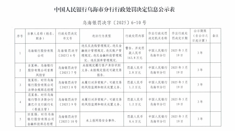 吉某林,乌海银行首席风险官,因未按规定履行客户身份识别义务、未按规定报送可疑交易报告,被??钊嗣癖?.8万元。张某柱,时任乌海银行法律合规部总经理,因未履行对异常账户、可疑交易的风险监测和相关处置义务,被??钊嗣癖?.2万元。范某春,时任乌海银行鄂尔多斯分行康巴什支行副行长(委派主管),因未履行对异常账户、可疑交易的风险监测和相关处置义务,被??钊嗣癖?.2万元。田某强,时任乌海银行金融科技部总经理,因未上报网络安全事件,被??钊嗣癖?.6 万元。