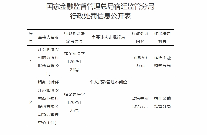 江苏泗洪农商银行因个人贷款管理不到位,被???0万元,时任该行贷后管理中心主任祖永被警告并被罚款7万元。