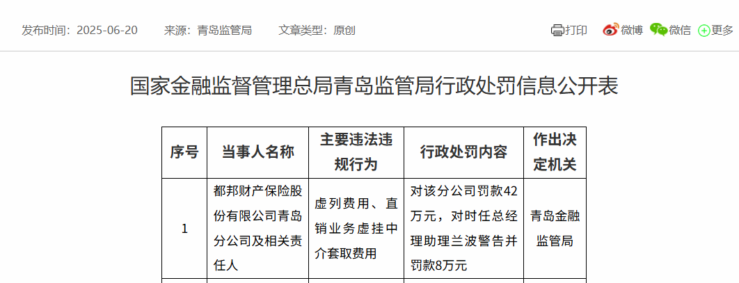 都邦财险青岛分公司因虚列费用、直销业务虚挂中介套取费用收42万罚单