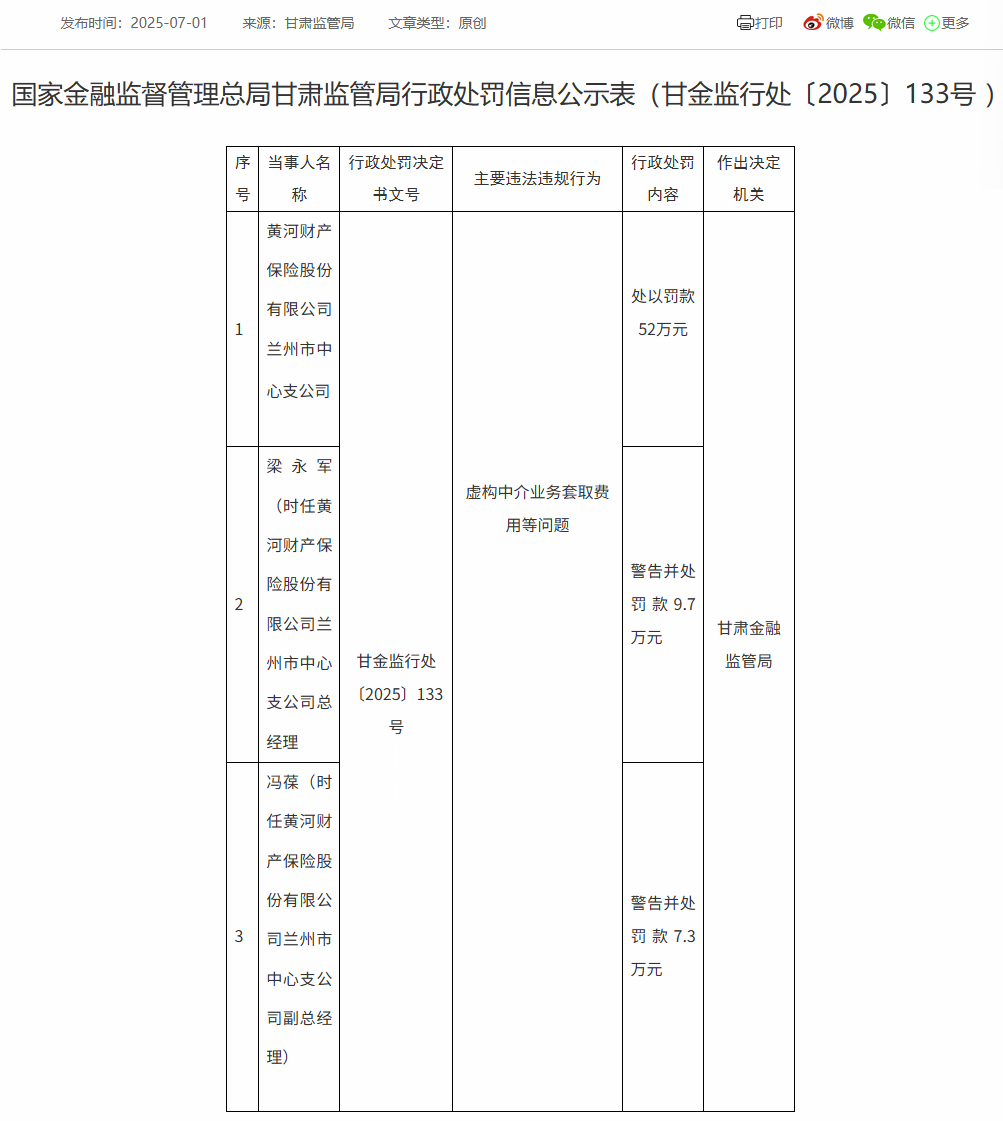 7月1日,国家金融监督管理总局发布处罚信息,因虚构中介业务套取费用等问题,黄河财产保险股份有限公司兰州市中心支公司被处以罚款52万元,梁永军(时任黄河财产保险股份有限公司兰州市中心支公司总经理、冯葆(时任黄河财产保险股份有限公司兰州市中心支公司副总经理)分别警告并处???.7万元、7.3万元。