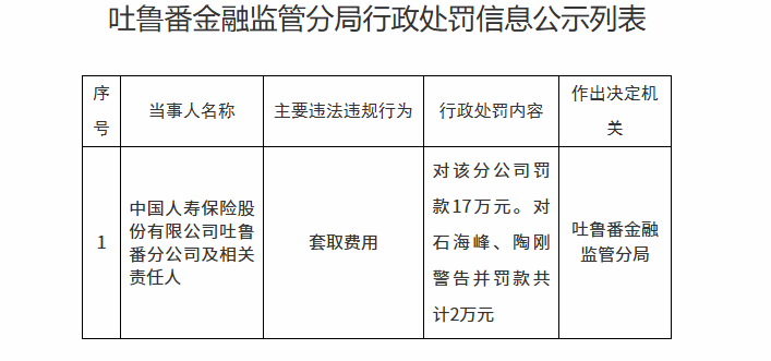 7月23日,国家金融监管总局官网消息显示,中国人寿吐鲁番分公司因套取费用,被???7万元。相关责任人石海峰、陶刚均被警告并罚款共计2万元。