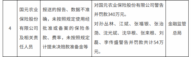 8月1日,国家金融监督管理总局发布行政处罚信息公示,国元农业保险股份有限公司因报送的报告、数据不准确,未按照规定使用经批准或备案的保险条款、费率,未按照规定计提未决赔款准备金等3项违规,被警告并罚款340万元;同被点名处罚的还有孙丛林、江斌、张福银、张治渤、沈光斌、沈华根、张来根、刘磊、李传盛等9名相关责任人员,被警告并处以??罟布?4万元。