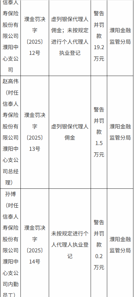 8月6日,国家金融监督管理总局发布处罚信息,因虚列银保代理人佣金;未按规定进行个人代理人执业登记,信泰人寿保险股份有限公司濮阳中心支公司被警告并罚款19.2万元;因虚列银保代理人佣金,赵高伟(时任信泰人寿保险股份有限公司濮阳中心支公司总经理)被警告并???.5万元,孙博(时任信泰人寿保险股份有限公司濮阳中心支公司内勤员工)被警告并???.2万元。
