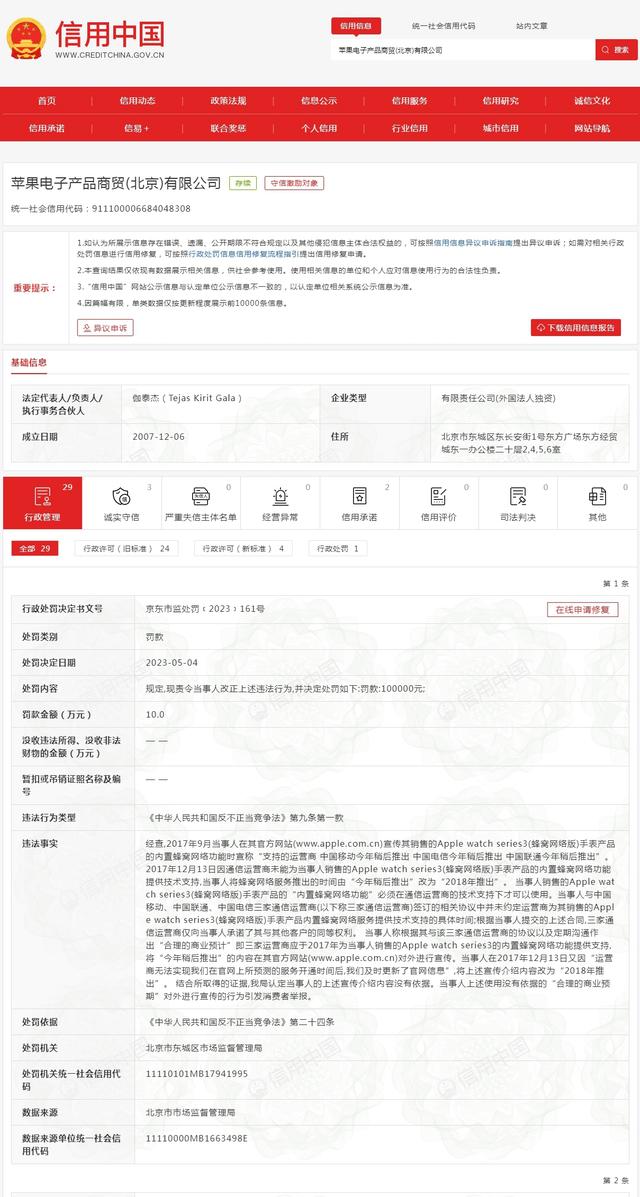 近日,信用中国网站公布的一则行政处罚决定书显示,苹果电子产品商贸(北京)有限公司被罚10万元。
