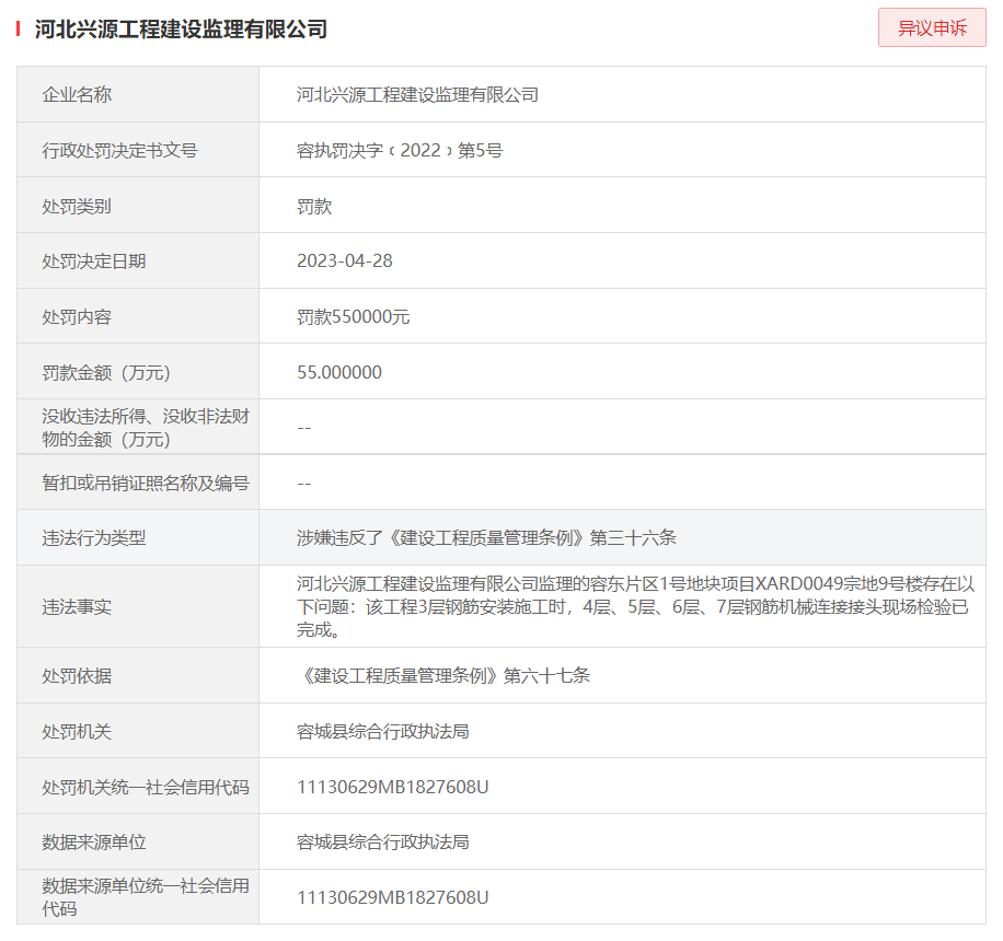 近日,信用中国(河北)网站披露,河北兴源工程建设监理有限公司因违反《建设工程质量管理条例》被处罚。