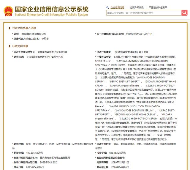 国家企业信用信息公示系统显示,德昭(重庆)商贸有限公司违规经营化妆品被罚没超29亿元。