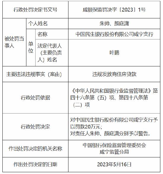 5月23日消息,国家金融监督管理总局网站披露的行政处罚信息公开表显示,民生银行咸宁支行因违规发放商住房贷款,被监管???/span>20万元;另外,责任人朱帅、颜庭潇分别被警告。