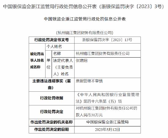 5月22日消息,据国家金融监督管理总局发布的行政处罚信息公开表显示,杭州锦江集团财务有限责任公司因票据管理不审慎,被监管处以??钊嗣癖?/span>30万元。