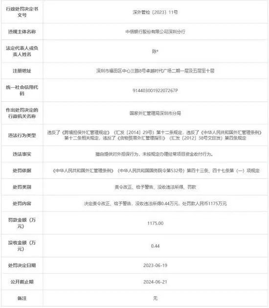 据国家外汇管理局,因存在擅自提供对外担保行为,中信银行深圳分行被责令改正,给予警告,没收违法所得0.44万元,???/span>1175万元。