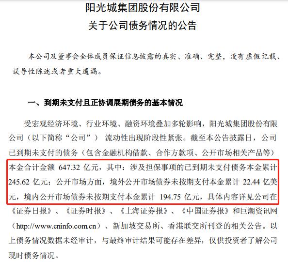 此前,阳光城发布公告,截至5月12日,公司已到期未支付的债务(包含金融机构借款、合作方款项、公开市场相关产品等)本金合计金额647.32亿元,相较于4月公布的448.5亿又增加了近200亿。