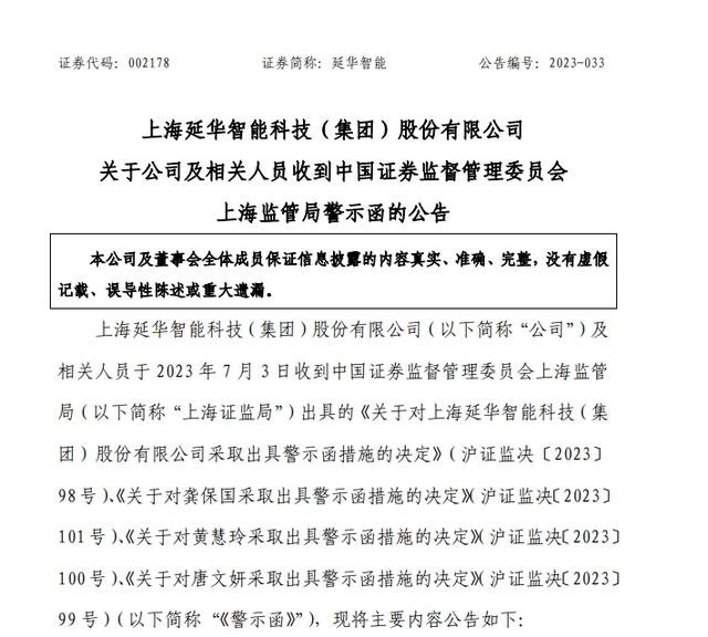 上海证监局指出,按照《上市公司信息披露管理办法》(证监会令第182号)第五十二条第三项的规定,现决定对延华智能采取出具警示函的监督管理措施。