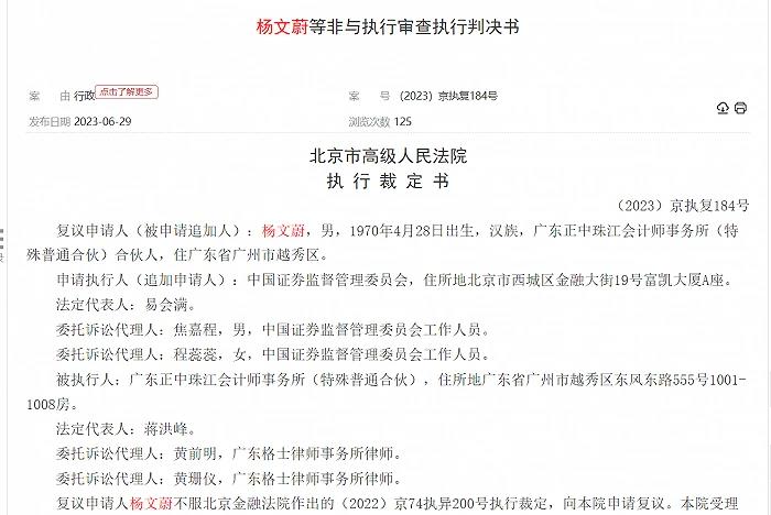 但是这笔??罨刮绰涫?。中国证监会与广东正中珠江会计师事务所(特殊普通合伙)行政非诉执行一案(执行依据:(2021)京74行审11号行政裁定书)过程中,中国证监会向北京金融法院提出追加杨文蔚为被执行人的申请。