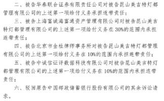 华泰证券在此判决中,承担了全额连带赔付比例。如果灯都公司不执行法院判决,那么华泰证券就要代为赔偿5.6亿元。作为财务顾问的华泰证券为何会被高比例判赔,而该专项计划管理人海富通资管的判赔比例却相对较低?