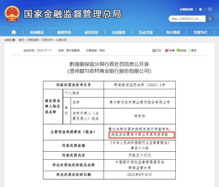 7月11日,国家金融监督管理总局网站发布的行政处罚信息显示,贵州都匀农村商业银行股份有限公司因重大关联交易未按规定进行审查审批、违规发放零首付商业用房购房贷款,被处以罚款五十万元顶格惩罚。
