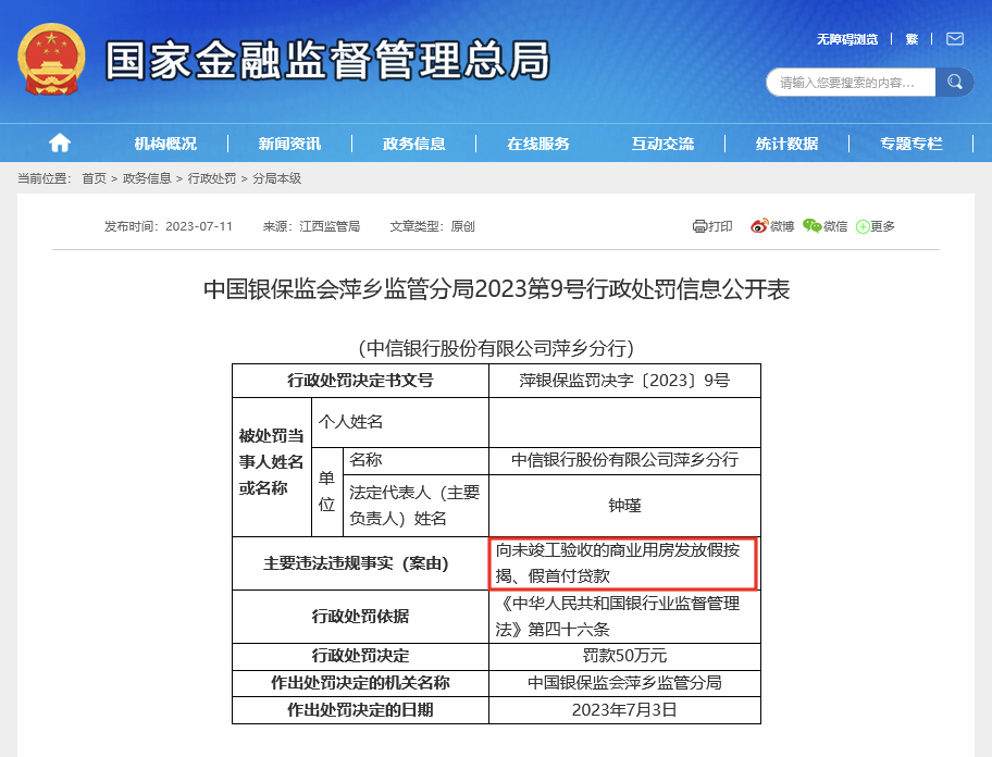 对于中信银行萍乡分行“向未竣工验收的商业用房发放假按揭、假首付贷款”违法行为,中国银保监会萍乡监管分局依据《中华人民共和国银行业监督管理法》第四十六条对其作出罚款50万元的顶格处罚。