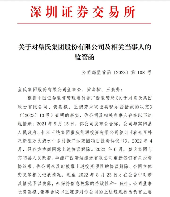 监管函显示,根据广西证监局《关于对皇氏集团股份有限公司、黄嘉棣、王婉芳采取出具警示函措施的决定》(〔2023〕13号)查明的事实,公司及相关当事人存在以下违规情形:
