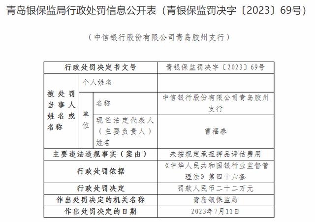 7月19日,国家金融监管总局青岛监管局发布的青银保监罚决字〔2023〕69号罚单显示,中信银行(601998.SH)青岛胶州支行存在“未按规定承担押品评估费用”的违法违规事实,青岛银保监局依据《中华人民共和国银行业监督管理法》第四十六条规定,决定对中信银行青岛胶州支行???/span>22万元。