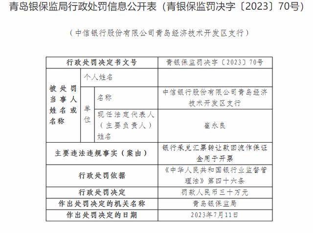 同日,青岛监管局发布的青银保监罚决字〔2023〕70号罚单显示,中信银行青岛经济技术开发区支行存在“银行承兑汇票转让款回流作保证金用于开票”的违法违规事实,青岛银保监局依据《中华人民共和国银行业监督管理法》第四十六条规定,决定对中信银行青岛经济技术开发区支行???/span>30万元。