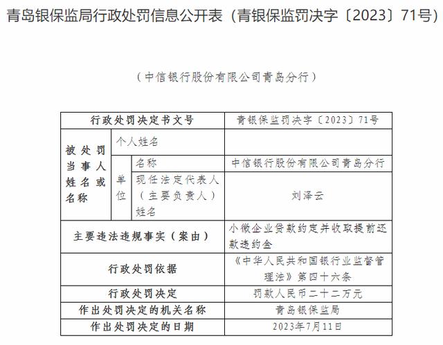 另外,青岛监管局发布的青银保监罚决字〔2023〕71号罚单显示,中信银行青岛分行存在“小微企业贷款约定并收取提前还款违约金”的违法违规事实,青岛银保监局依据《中华人民共和国银行业监督管理法》第四十六条规定,决定对中信银行青岛分行???/span>22万元。