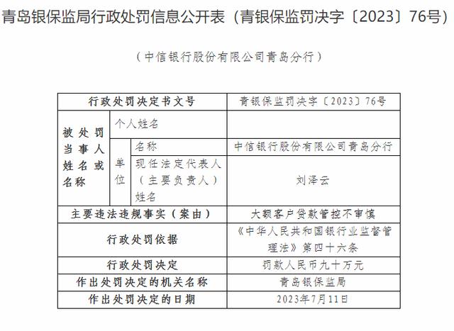 青岛监管局发布的青银保监罚决字〔2023〕76号罚单显示,中信银行青岛分行存在“大额客户贷款管控不审慎”的违法违规事实,青岛银保监局依据《中华人民共和国银行业监督管理法》第四十六条规定,决定对中信银行青岛分行???/span>90万元。
