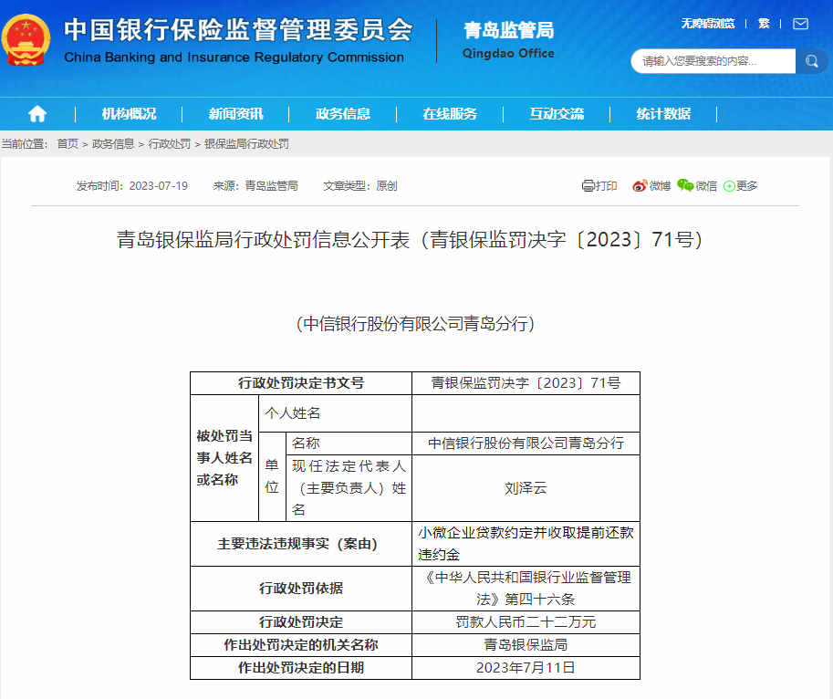 其中,中信银行青岛分行因“小微企业贷款约定并收取提前还款违约金”被罚22万。